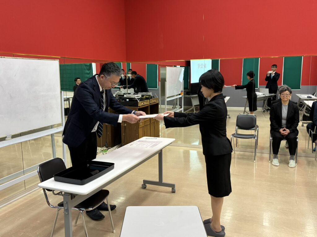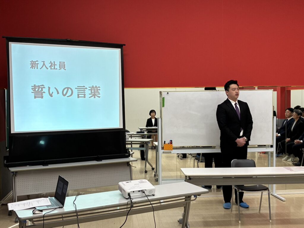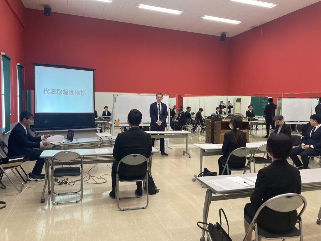 式典では、代表取締役をはじめとする役員や先輩社員から、新入社員へ向けた温かい歓迎と激励の言葉が贈られました。その中で強く伝えられたのは、「目配り・気配り・心配り」を大切にする姿勢です。日々の業務の中で周囲への配慮を忘れず、お客様や仲間から信頼される存在へと成長してほしいという期待が込められています。